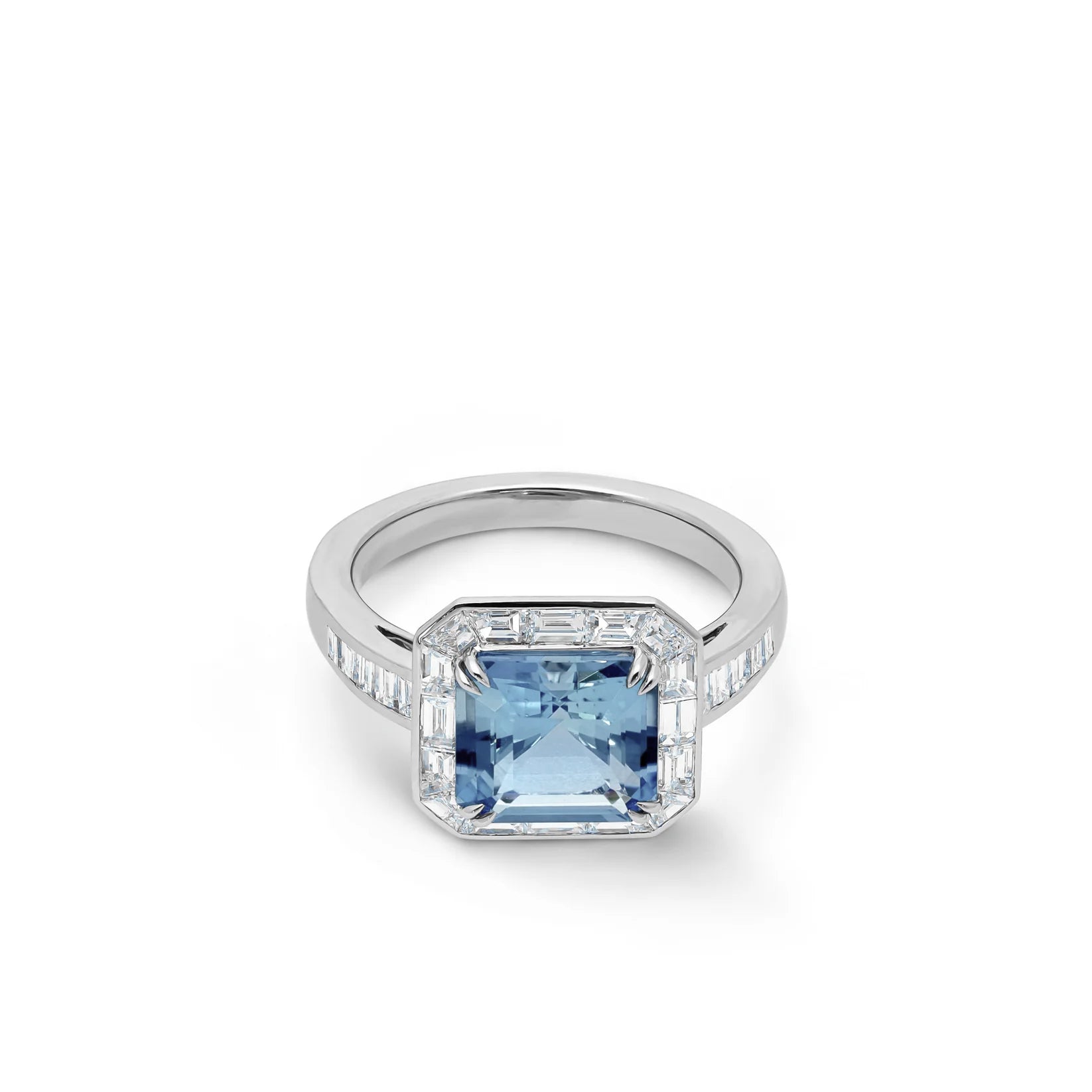 Dieser exquisite Adrian-Aquamarinring verfügt über einen 2.52 ct. Aquamarinstein und 26 schillernde Diamanten mit einem Gesamtgewicht von 1.36 ct im eleganten Baguetteschliff. Dieser Ring ist die perfekte Mischung aus Eleganz und Luxus und verleiht jedem Ensemble einen Hauch von Raffinesse.